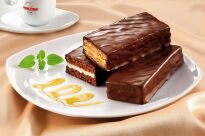 Polewa [cukier, tłuszcze roślinne (z ziaren palmowych, palmowy, shea)*, kakao w proszku o obniżonej zawartości tłuszczu 6%, emulgator (lecytyna sojowa, poliglicerol-polyricin-oleat), ekstrakt z wanilii], cukier, margaryna [olej palmowy*, w pełni utwardzony olej kokosowy, woda, olej rzepakowy, sól kuchenna, emulgator (mono- i diglicerydy kwasów tłuszczowych, lecytyna słonecznikowa), regulator kwasowości (kwasek cytrynowy), aromat], mleko, mąka pszenna, mieszanka jajeczna, syrop glukozowy, olej rzepakowy, miód 3%, kakao o obniżonej zawartości tłuszczu 1%, woda, substancja spulchniająca (wodorowęglan sodu), masło, aromat. Produkt może zawierać śladowe ilości orzechów włoskich.